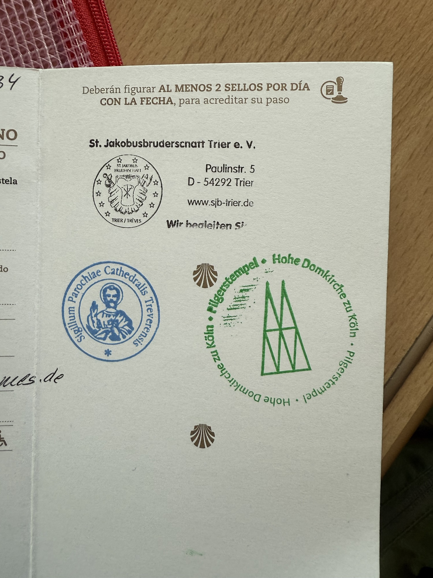 Wir sind dann mal weg….Die Vorfreude und die Aufregung war genauso groß wie beim ersten Mal. Vor allem beschäftige uns die spannende Frage: ob die Züge pünktlich und die Anschlüsse zum Flughafen Frankfurt klappen. Und ja, man muss die Deutsche Bahn loben -es lief alles wie am Schnürchen. Die Umstiegszeit in Köln konnten wir sinnvoll nutzen mit dem Besuch des Doms, wo es auch den ersten Stempel auf unser Pilgerreise gab. Pünktlich erreichten wir den Flughafen Frankfurt. Dort packen wir unsere Rucksack in wunderschöne Coupons ein, was aber wie sich herausstellte, völlig überflüssig war.