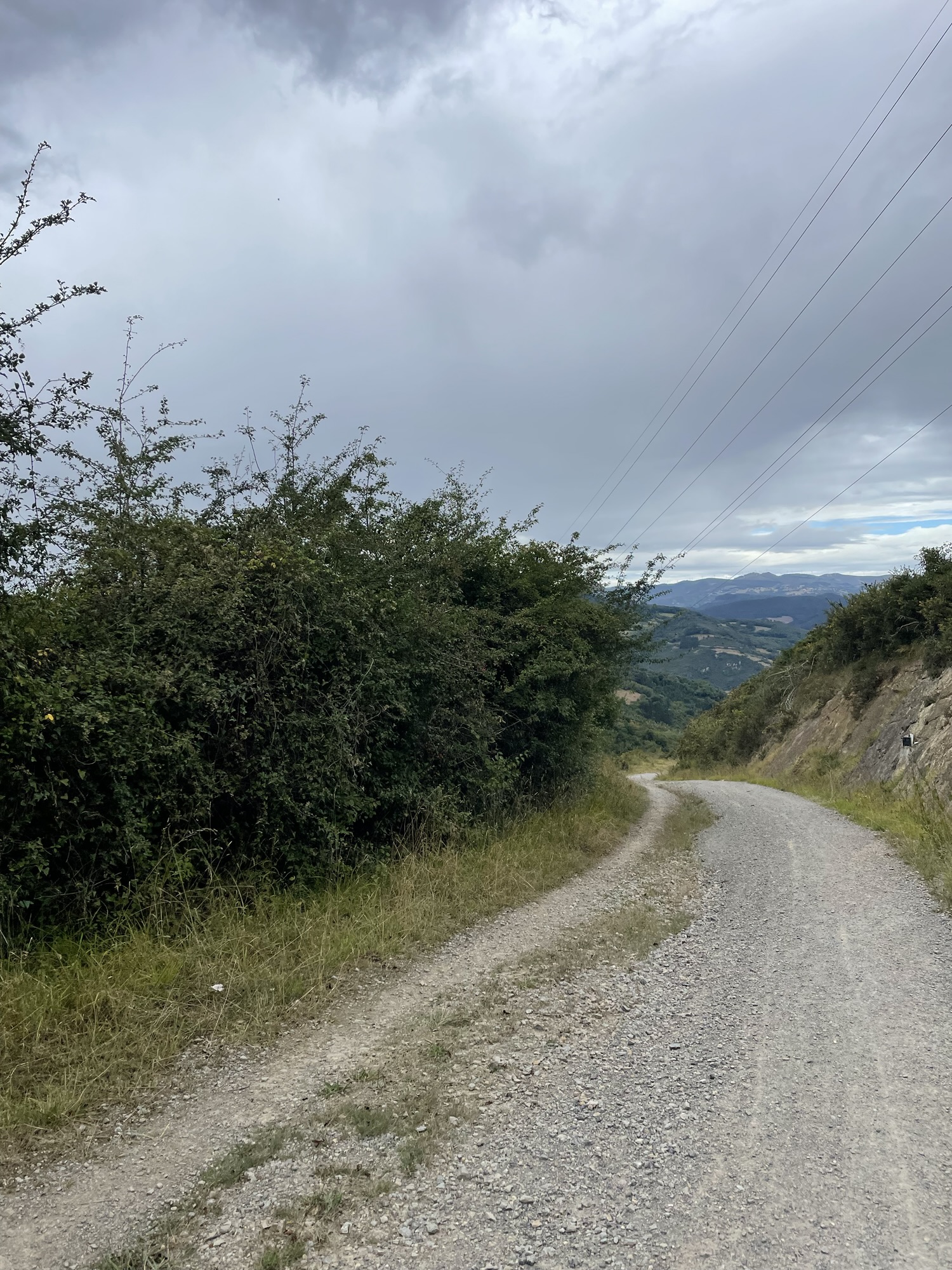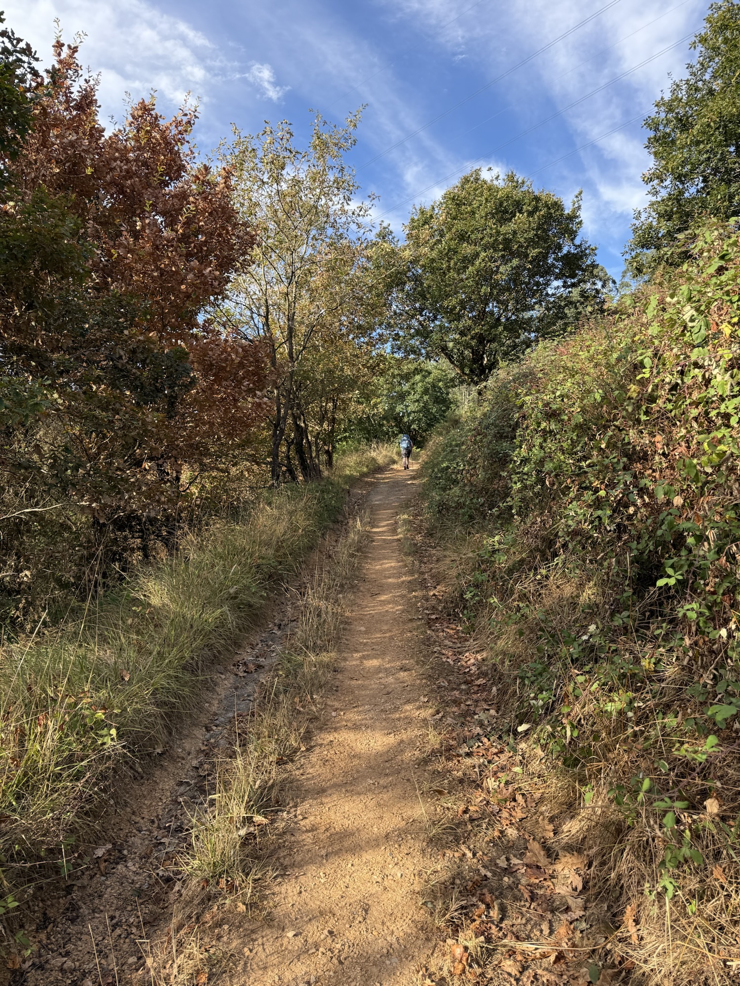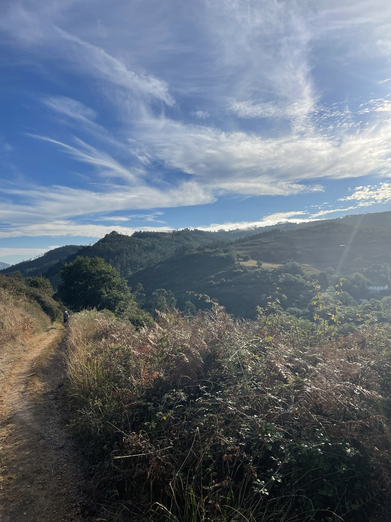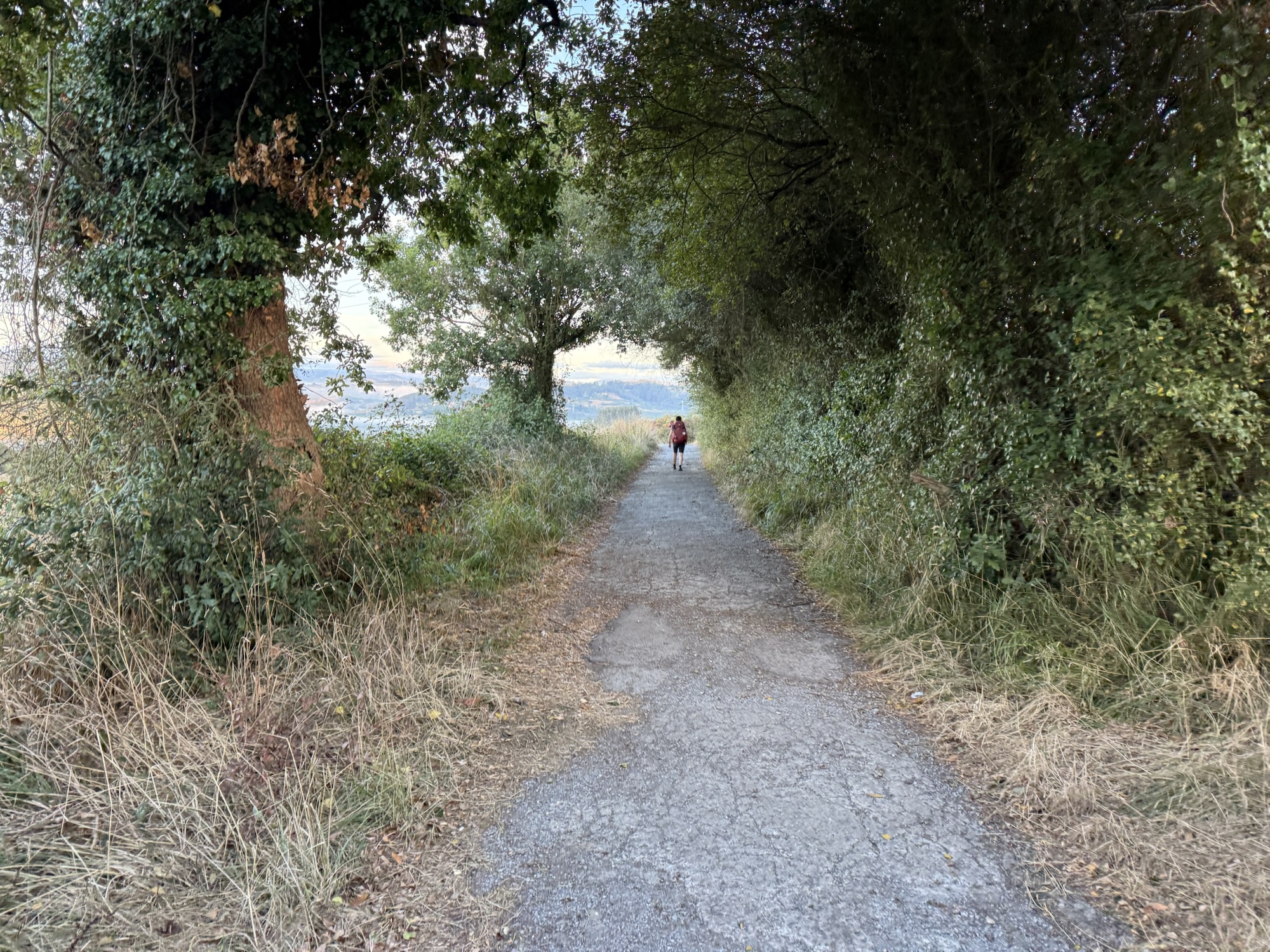Landschaftlich eine sehr schöne Etappe, aber am Ende doch ne kleine Herausforderung mit dem Anstieg. Irgendwann musste ich in meinem Rhythmus weitergehen und habe meine beiden Mitpilger zurückgelassen. Habe beschlossen, dass ich oben auf den Berg auf sie warte. Habe ich auch getan aber die zwei haben dann die Bank 20 m vor der Kuppe entdeckt und sich da niedergelassen. Lustig und ich steh und warte… Am Ende haben wir doch noch zusammen gefunden.