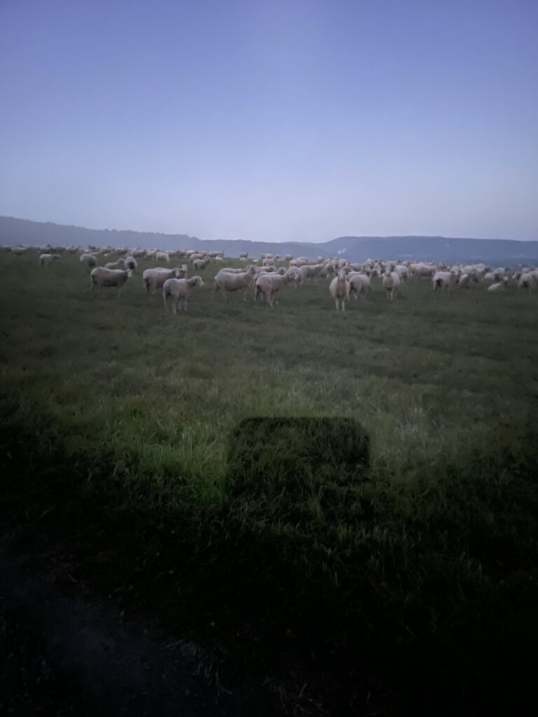 6 Uhr leise aus dem Haus geschlichen. Der Himmel war noch voller Sterne. Bin auf weiter Flur alleine unterwegs. Der Weg führt in den Wald. Es ist so still und dunkel. Plötzlich ein Eulenruf ganz in der Nähe- da zuckst du aber zusammen. Gehe weiter links Felder rechts noch immer der Wald. Dreh mich so rum und auf dem Feld leuchtende Punkte. Denke hoffentlich keine Rotte Wildschweine, komme näher und die Punkte entpuppen sich als Schafherde. War schon spooky.